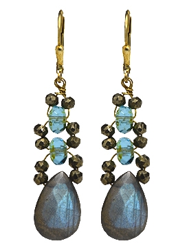 Faceted labradorite teardrop briolettes and faceted pyrite and crystal beads on 22K vermeil leverback earring fixtures. 2 1/2" L x 1/2" W