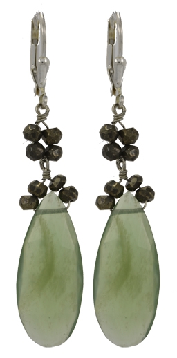 Faceted serpentine jade teardrops accented by faceted pyrite beads on sterling silver leverback earring fixtures. 2 3/4" L x 1/4" W