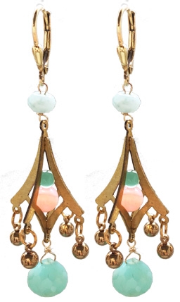 Mid century modern chandelier findings with aqua chalcedony drops and washed out hot pink, vintage glass, amazonite and brass accents on 22K vermeil lever back earring fixtures. 1.75"L x 1"W