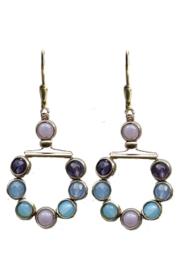 Faceted and dyed new jade, amethyst and smooth glass beads surrounded in brass rings on 22K vermeil leverback earring fixtures.
