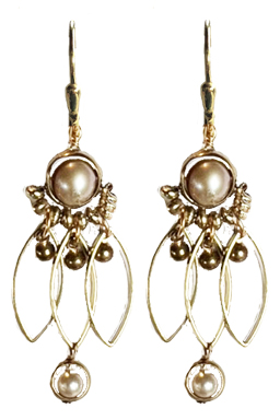 Elegant, airy lightweight drops with champagne colored freshwater pearl beads encased in brass rings with brass findings on 22K vermeil leverback earring fixtures (sterling silver dipped in 22K gold fill).