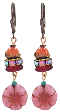 Pressed glass translucent pink flowers with Czecho irridescent rondelles, faceted dyed carnelian on 22K vermeil lever-back earring fixtures. 1.75" L x .75"W