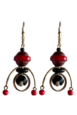 Mid century modern dangly design made with vintage and new glass beads and brass findings on 22K vermeil lever back earring fixtures.