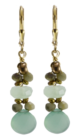 Faceted pale turquoise green chalcedony drops with faceted tigereye & new jade on 22K vermeil lever back earring fixtures. 2"L x .5"W