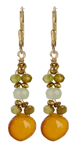 Faceted light amber chalcedony drops with faceted green garnet & serpentine jade on 22K vermeil lever back earring fixtures. 2"L x .5"W