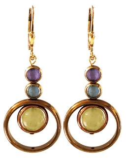 Mod arrangement of brass hoops surrounding faceted olive jade, blue agate and amethyst on 22K vermeil lever back earring fixtures. 1.75""L x 1.25"W