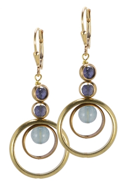 Mod arrangement of brass hoops surrounding faceted iolite & dyed blue new jade on 22K vermeil lever back earring fixtures. 2"L x 1.25"W
