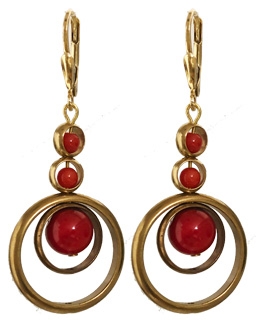 Mod arrangement of brass hoops surrounding red coral beads on 22K vermeil lever back earring fixtures. 1.75"L x 1.25"W