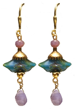 Fancy Czech floral beads with crystal and brass accents with faceted amethyst drops on 22K vermeil lever back earring fixtures. 1.5"L x .5"W