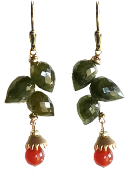 Faceted green garnet with carnelian drops and brass caps on 22K vermeil lever back earring fixtures.